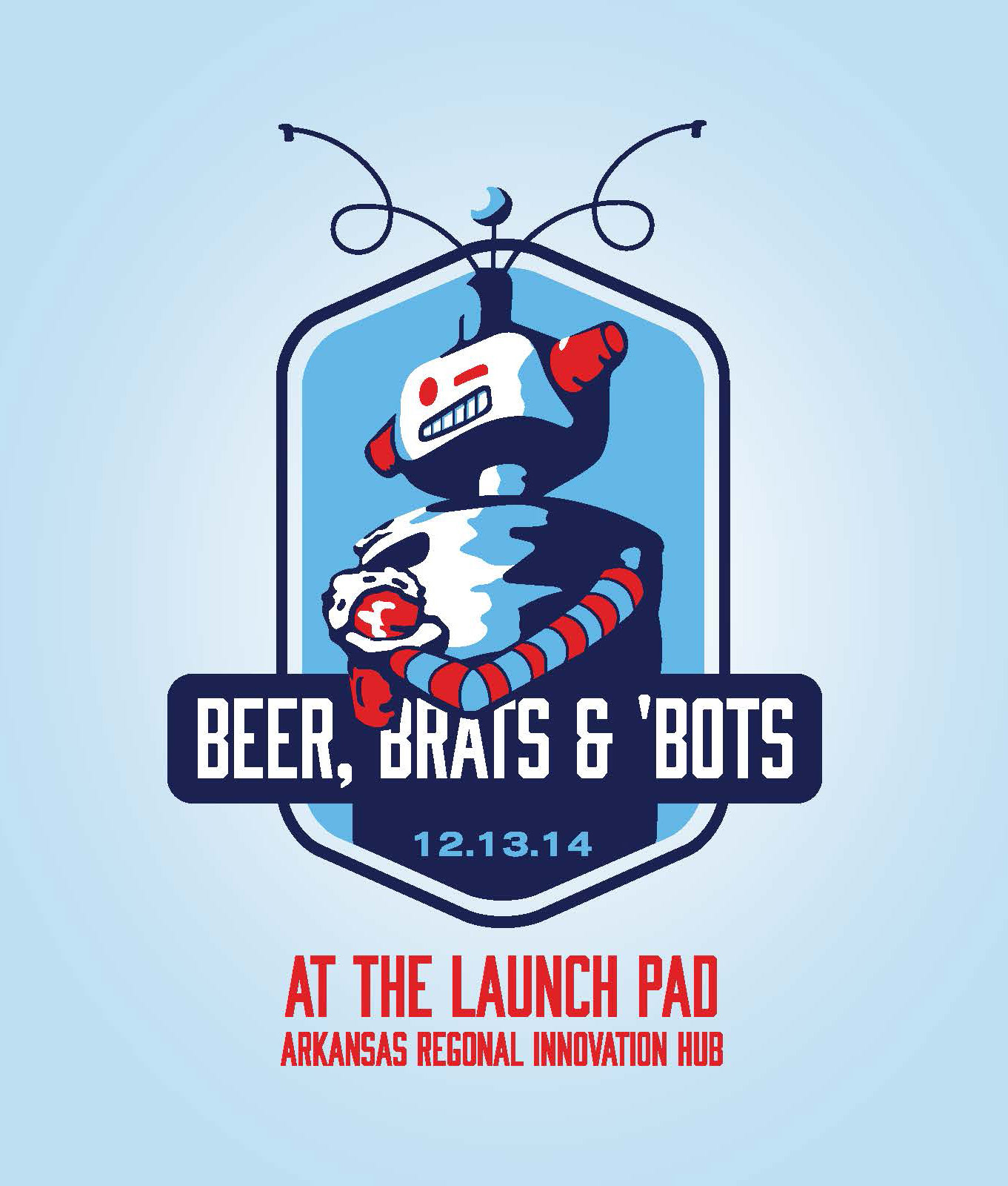 Beer, Brats & ‘Bots, event logo for The Launch Pad | North Little Rock, AR | December 2014 | A beer drinking keg ‘bot. What more could a tech nerd want in an event and its respective tee shirt?